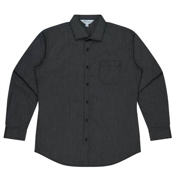 A superbly crafted, striped shirt featuring a top stitched and pleated front placket. The collar is top stitched with a contrast directional cut cuff with an angled finish.